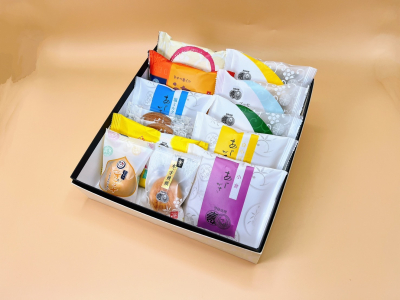 ブッセママレード・ブッセバニラ・ブッセ(季節の味)・あじがさ小倉・あじがさ白小豆・ かすていら抹茶・かすていらザラメ・ばーむくーへん・金の本ノ字饅頭・ミルク栗万十・味ふぶき(おかき) ×各1個、 和歌浦煎餅プレーン×2個