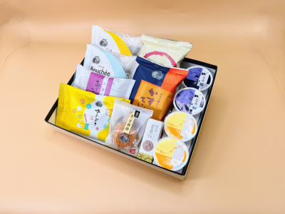 ブッセママレード・ブッセバニラ・あじがさ小倉・かすていらザラメ・ばーむくーへん・味ふぶき(おかき) 金の本の字饅頭 美似芭里絵 煉羊羹×各1個、 プリン×2個、 水羊羹個×2個