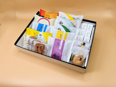 ブッセママレード・ブッセバニラ・ブッセ(季節の味)・あじがさ小倉・あじがさ白小豆・あじがさ塩ミルク・かすていらザラメ・ばーむくーへん・金の本ノ字饅頭・ミルク栗万十・味ふぶき(おかき)×各1個、美似芭里絵 煉・大納言・栗×各2個 和歌浦煎餅プレーン×4袋